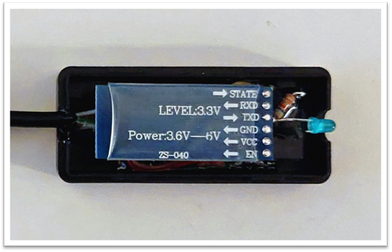 内部。レベル変換回路基板の上にBluetoothモジュールを重ねた亀の子 構成。