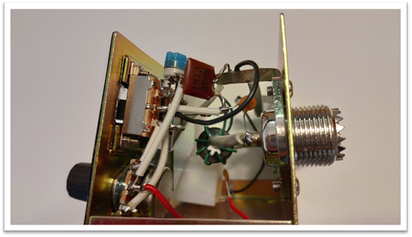 内部。全て空中配線。進行、反射電力を測れるようにするためにフロント パネルを剥がして右側のスライドスイッチを2回路2接点に交換。